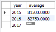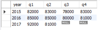 null을 사칙연산하려면 coalesce 함수를 사용해 적절한 값으로 바꾸어야 한다. 하지만 q3과 q4의 값을 0으로 바꿔버리면 매출 합계를 4로 나누게 되어 평균값이 크게 낮아진다.