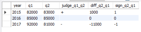 case식을 사용해 q1보다 q2의 매출이 많은 경우에는 +, 같은 경우에는 공백, 적은 경우에는 - 를 출력.
