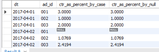 2017년의 q1과 q2 매출만으로 평균을 구하려면 null이 아닌 컬럼의 수를 세서 나눠야 한다. coalesce 함수와 sign 함수를 조합해 분모의 값을 계산해야한다.
