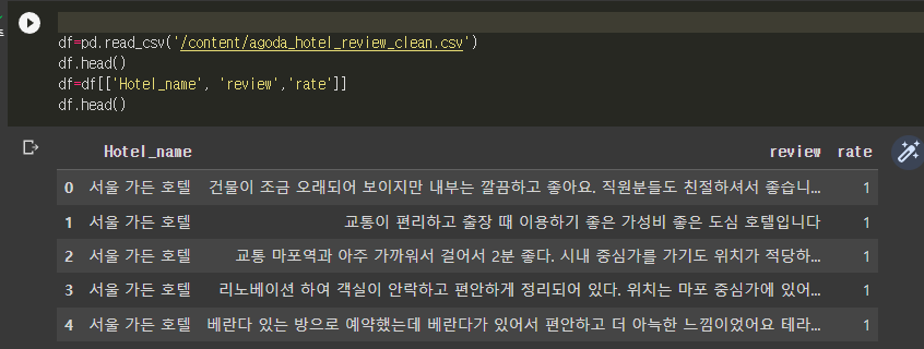 아 물론 변수들이 훨씬 더 많지만 이번 연구에서 사용하는 변수는 이거 세 개뿐일 것 같아서 이렇게 세 개만 가져왔다. 호텔이름, 리뷰, 별점.