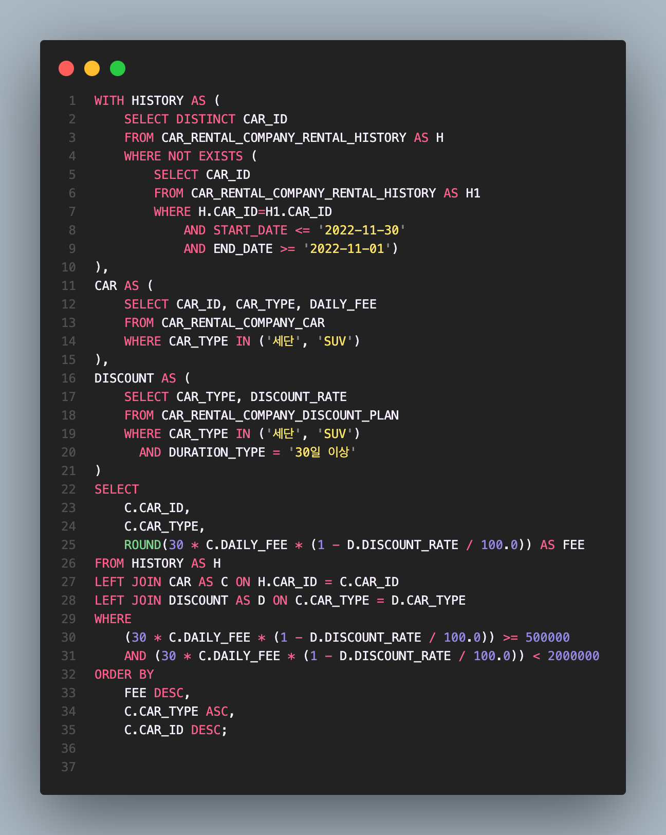 여기도 마찬가지, 30일 이상인 할인율만 가져오면 되니까 30일 이상, 그리고 suv, 세단만 가져오기