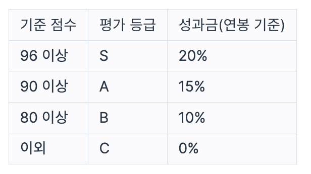 case 문으로 평가점수 별로 grade를 나누어줬고, 성과금 비율을 적용해줬다. 평가등급도 같이 출력해줘야 하기 때문에 평가등급과 평가 등급에 따른 성과금 계산은 따로 해줘야한다는 것을 잊지 말자!!!