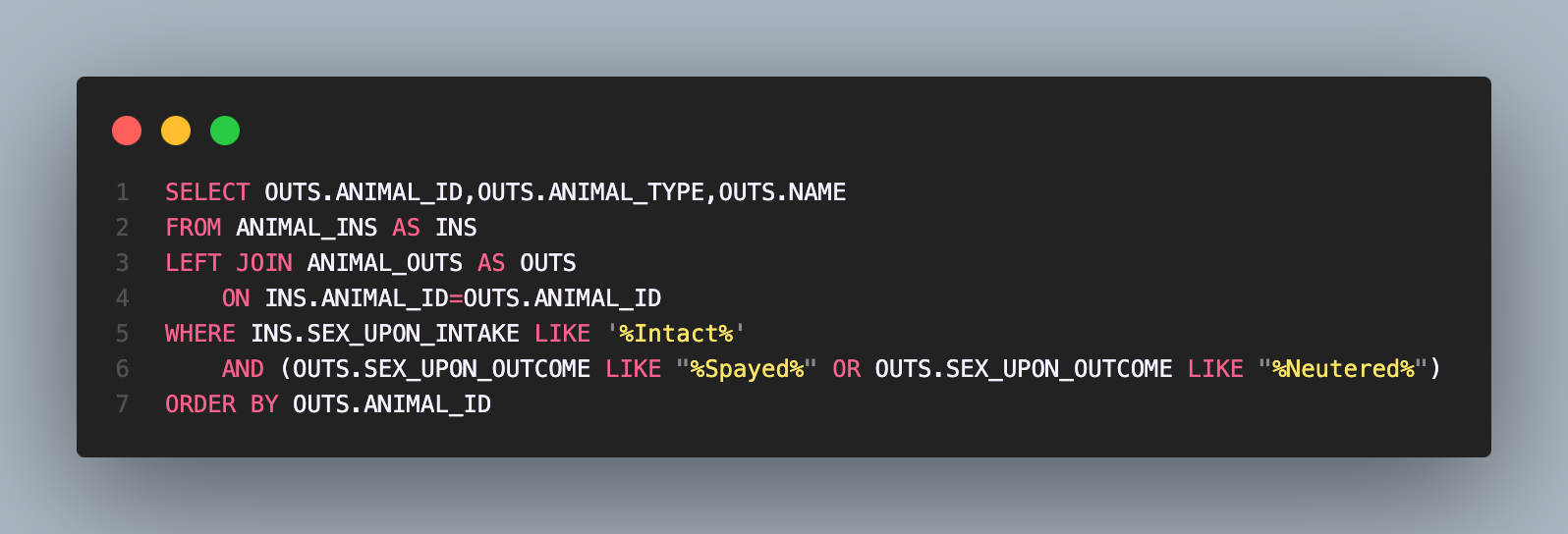 AND (OUTS.SEX_UPON_OUTCOME LIKE "NEUTERED%" OR OUTS.SEX_UPON_OUTCOME LIKE "SPAYED%")