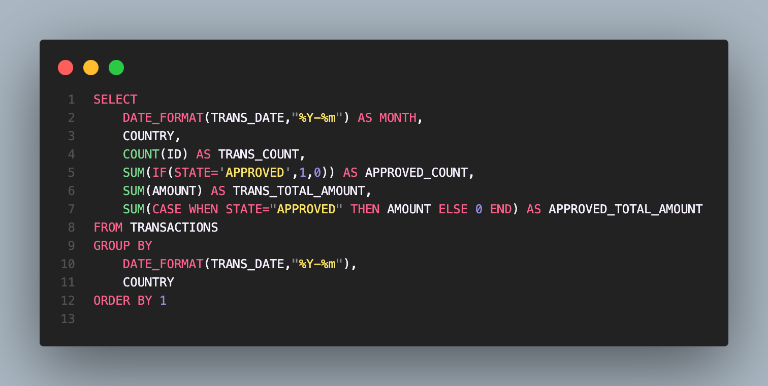 월별, 국가별로 거래건수와 총액, 승인된 거래 건수와 총액을 찾는 sql 쿼리를 구현하는 것이 문제!