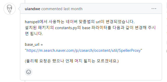 hanspell에서 사용하는 네이버 맞춤법의 url이 변경되어서 나타나는 문제!!