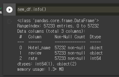 아 물론 변수들이 훨씬 더 많지만 이번 연구에서 사용하는 변수는 이거 세 개뿐일 것 같아서 이렇게 세 개만 가져왔다. 호텔이름, 리뷰, 별점.