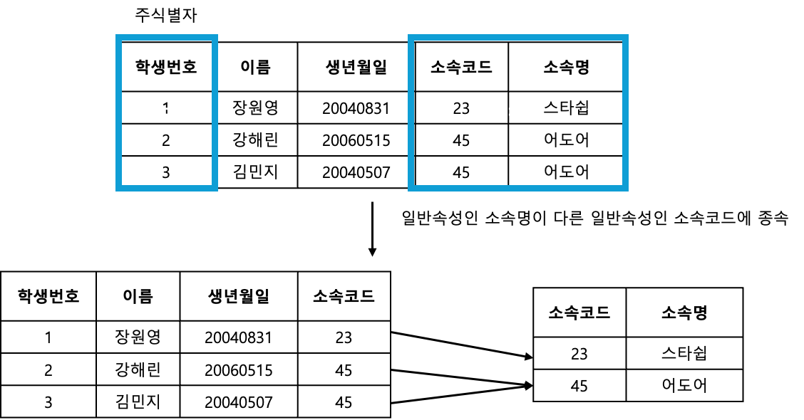 - 주식별자가 아닌 모든 속성 간에는 서로 종속될 수 없다.