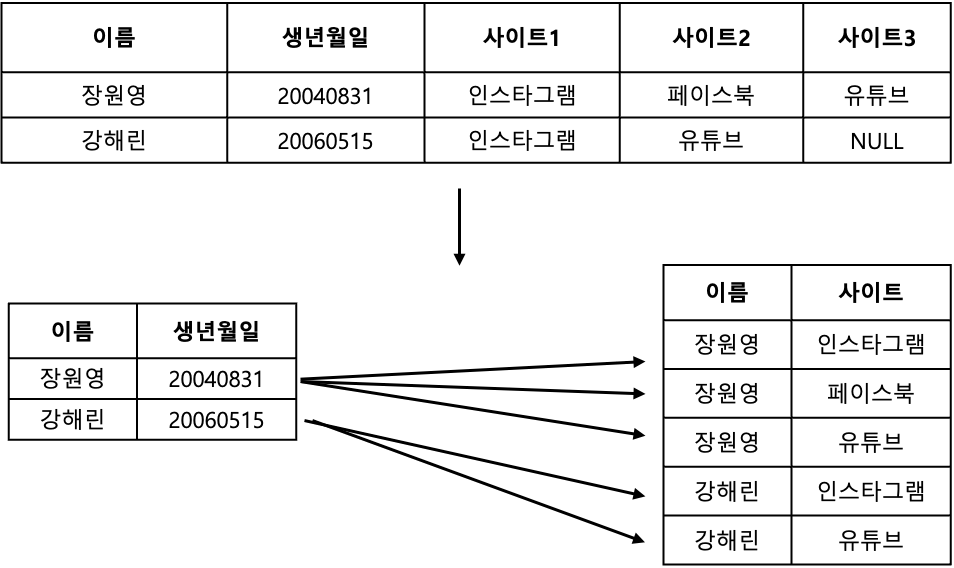 - 데이터 정합성(데이터의 정확성과 일관성을 유지하고 보장)을 위해 엔터티를 작은 단위로 분리하는 과정.