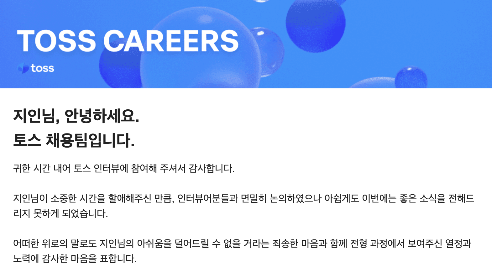 토스는 다음에 또 좋은 기회가 있다면 더더욱 성장해서 내가 원하는 직군에 도전해보려고 한다!!! 내가 진정으로 원하는 일이 뭔지 다시 생각해 볼 수 있었고, 내 커리어패스에 대해서도 좀 더 생각해 보게 되었다. 면접 보면서 내 가치관이었던 "직장보다 직업을 갖자"가 무너진 것 같아서 슬펐다...