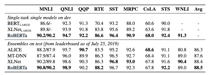 - 실제로 RoBERTa는 GLUE, SQuAD, RACE 같은 주요 벤치마크에서 최신 모델들을 뛰어넘는 성능을 기록했다.